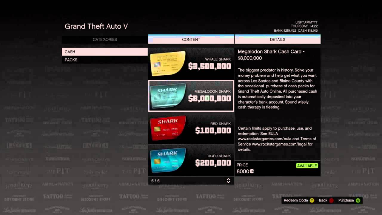 A multiplayerben van lehetőségünk GTA$-t vásárolnunk valódi pénzért. Ezt a játék menüjéből, az Xbox Games Store-ból tudjuk elérni. Itt különböző Shark kártyák közül tudunk választani: